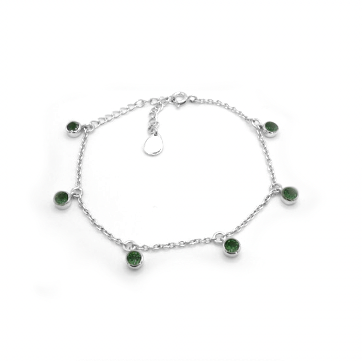 925 sterling silver chain bracelet featuring six round faceted Green Onyx gemstones in a beautiful deep green colour, set in chunky settings and hanging perfectly placed on a sterling silver chain with an adjustable extension chain.