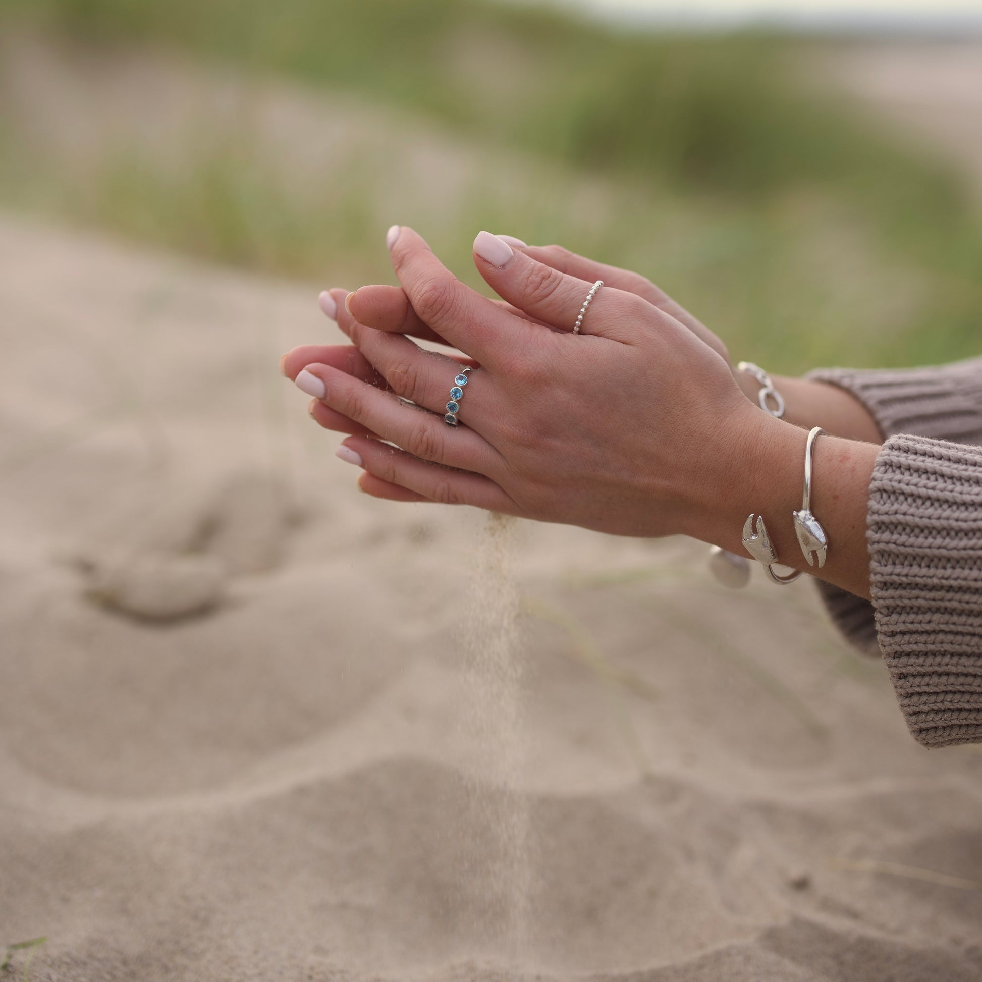 The linear ring features five round pale blue topaz faceted gemstones, set in a linear, rubber setting and finished with a D shape band to the back. This ring is our new favourite, perfect for wearing on its own or stacking alongside our stacking bands to add a bit of texture and interest.